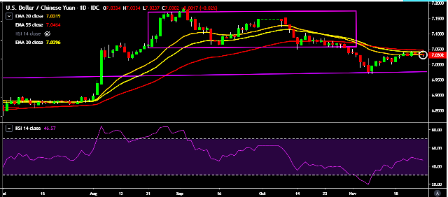 We prefer to take long position on USD/CNY only above 7.0420, stop loss at 7.02 and target of 7.0520/7.07.