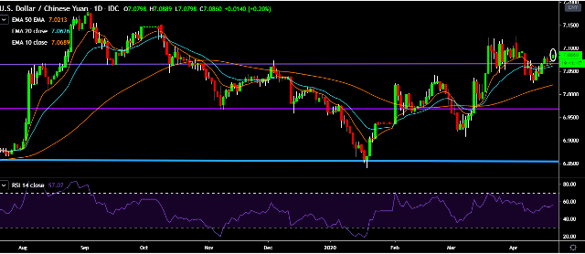 - Pair opens gap up at 7.0798 mark vs previous close at 7.0720 mark.