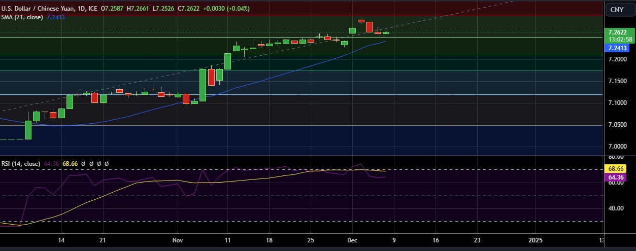 • Immediate resistance is located at 7.273(Dec 5th high), any close above will push the pair towards 7.295(23.6%fib)