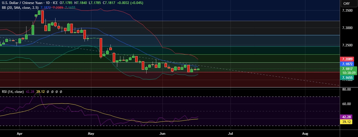 • Support is seen at 7.172(23.6%fib) and break below could take the pair towards 7.162 (Lower BB).