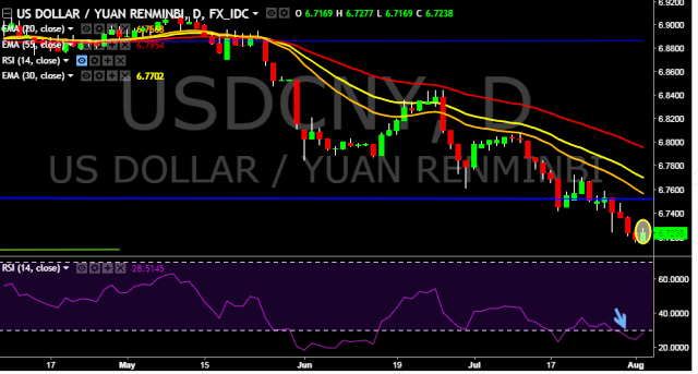 We prefer to take short position in USD/CNY only below 6.7150, stop loss at 6.7373 and target of 6.7011.
