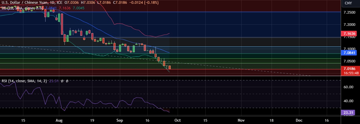 • Support is seen at 7.016(23.6%fib) and break below could take the pair towards 7.000 (Psychological level).