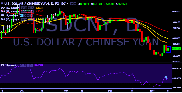 We prefer to take short position on USD/CNY only below 6.5054, stop loss 6.5210 and target of 6.4790.