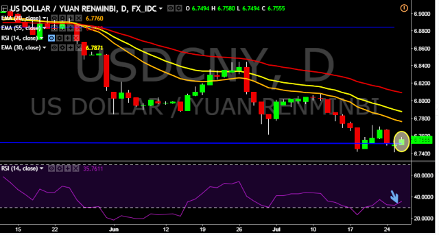 We prefer to take long position in USD/CNY around 6.7550, stop loss at 6.7409 and target of 6.7698.