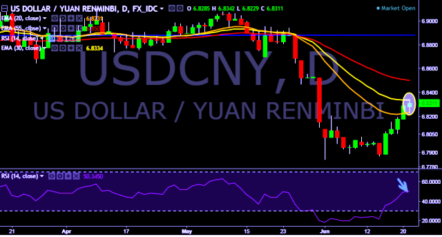 We prefer to take long position in USD/CNY around 6.8280, stop loss at 6.8174 and target of 6.8526.