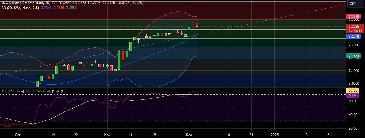 • Immediate resistance is located at 7.300(23.6%fib), any close above will push the pair towards 7.311(Higher BB)