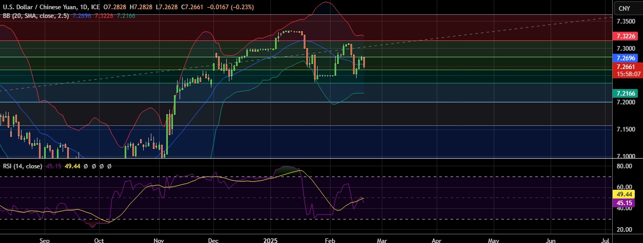 • Support is seen at 7.259(50%fib) and break below could take the pair towards 7.235(61.8%fib).