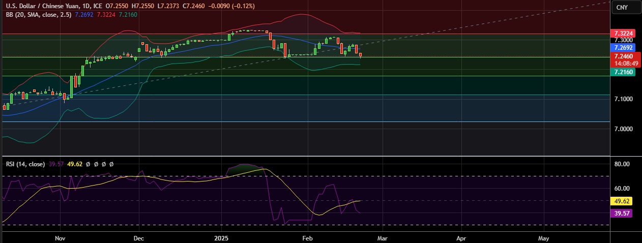 • Support is seen at 7.243(38.2%fib) and break below could take the pair towards 7.217(Lower BB).