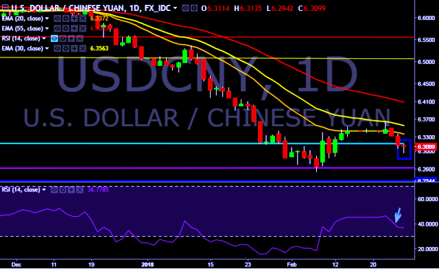 We prefer to take short position on USD/CNY around 6.3100, stop loss at 6.3372 and target of 6.2650.