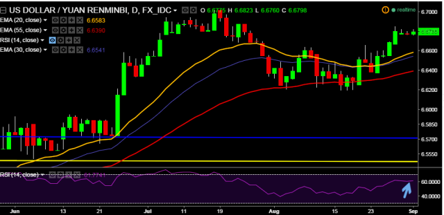 We prefer to take long position in USD/CNY only above 6.6823, stop loss 6.6670 and target 6.7017.