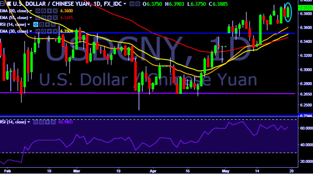 We prefer to take long position on USD/CNY only above 6.3950, stop loss 6.3700 and target of 6.4178.