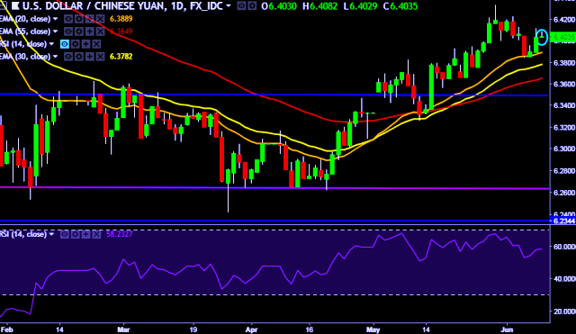 We prefer to take long position on USD/CNY only above 6.4112, stop loss 6.3889 and target of 6.4228/6.4329.