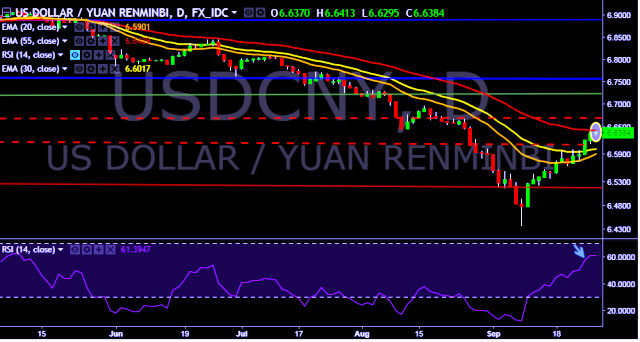 We prefer to take long position in USD/CNY around 6.6345, stop loss at 6.6250 and target of 6.6673.