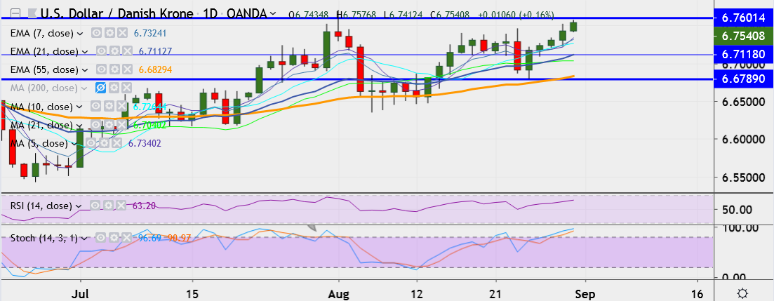 - USD/DKK is currently trading 0.1 percent up at 6.7524, having hit a high of 6.7576 earlier, its highest since August 1.