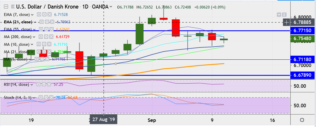 - USD/DKK is currently trading flat at 6.7554, having hit a low of 6.7302 last week, its lowest since August 29.