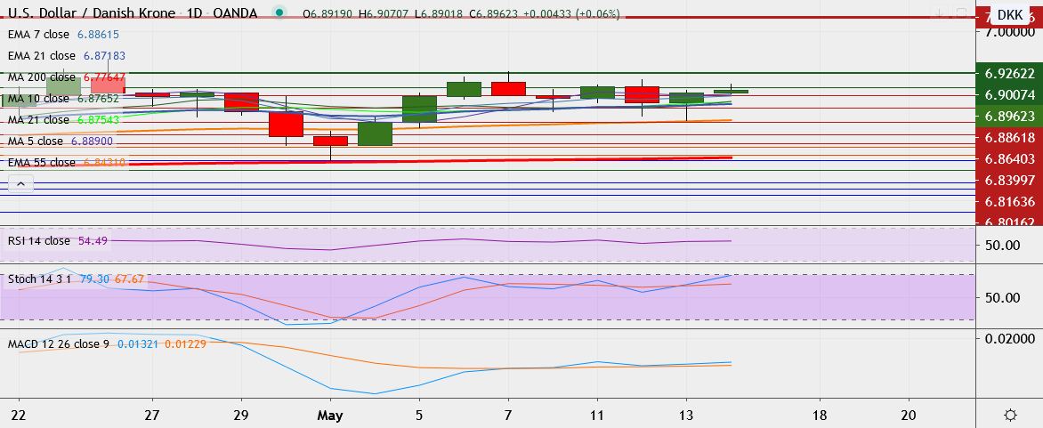 - USD/DKK is trading 0.1 percent up at 6.8970, having hit low of 6.8423 on Wednesday, its lowest since May 5.