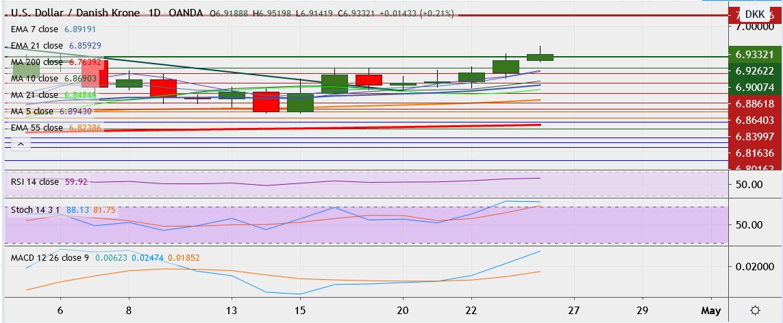 - USD/DKK is trading 0.2 percent higher at 6.9354, having hit high of 6.9519 earlier, its highest since Mar. 24.