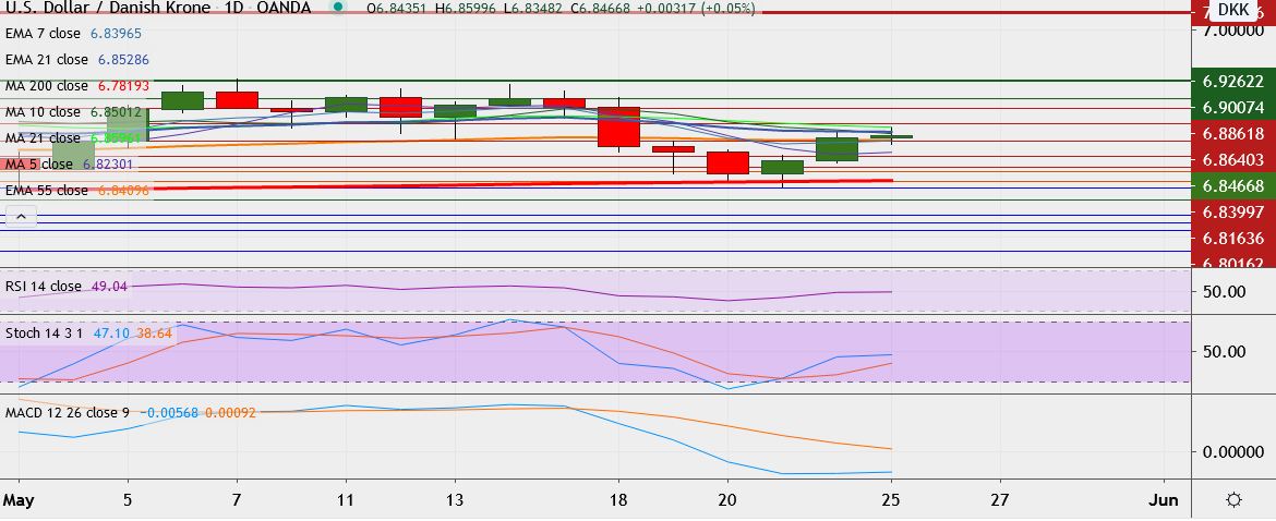 - USD/DKK is trading 0.05 percent up at 6.8451, having hit low of 6.7732 on Thursday, its lowest since May 1.