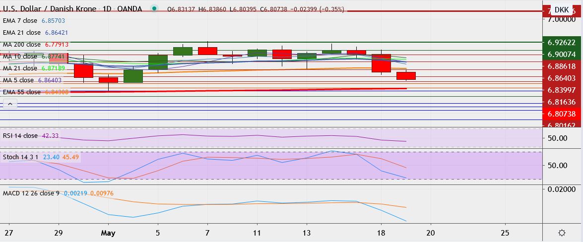 - USD/DKK is trading 0.4 percent down at 6.8067, having hit low of 6.8039 earlier, its lowest since May 4.