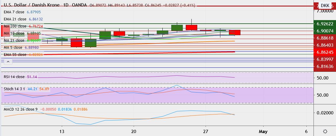 - USD/DKK is trading 0.2 percent lower at 6.8615, having hit high of 6.9519 on Friday, its highest since Mar. 24.