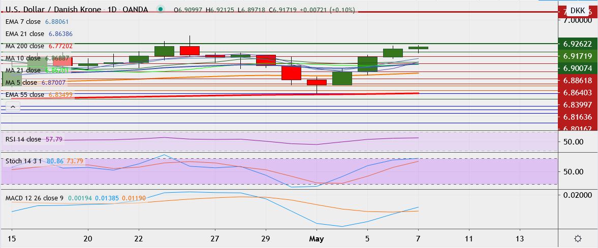 - USD/DKK is trading 0.1 percent up at 6.9168, having hit high of 6.9212 earlier, its highest since Apr. 24.