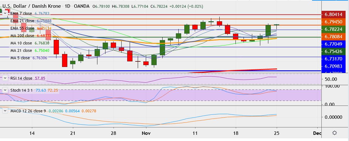 - USD/DKK is currently trading down at 6.7812, having hit high of 6.7901 on Monday, its highest since November 14.