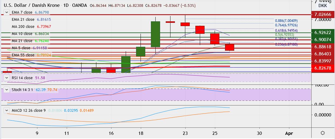 - USD/DKK is trading 0.6 percent down at 6.8250, having hit high of 7.0236 on Monday, its highest since April 2017.