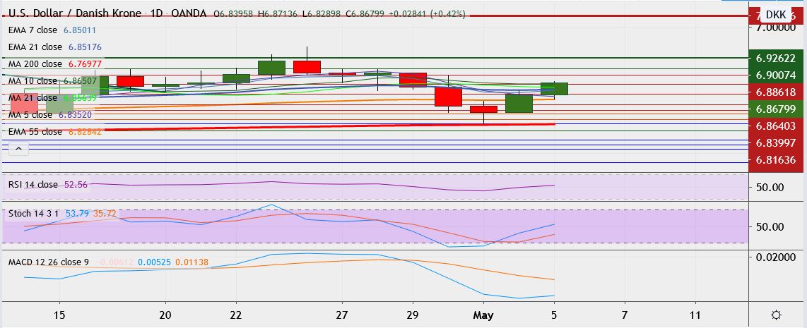 - USD/DKK is trading 0.4 percent up at 6.8687, having hit low of 6.7701 on Friday, its lowest since Apr. 1.
