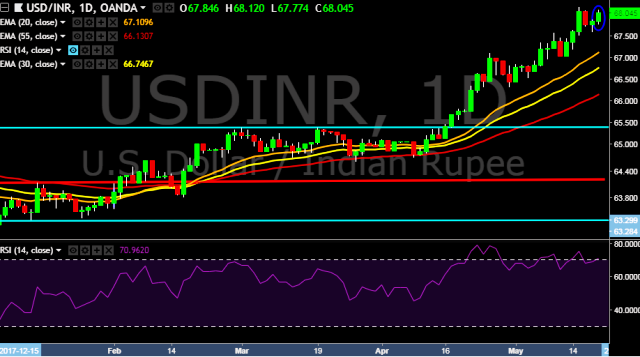 We prefer to take long position in USD/INR around 67.95, stop loss at 67.70 and target of 68.34.