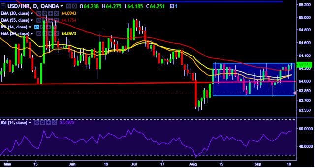 We prefer to take long position in USD/INR around 64.20, stop loss at 64.07 and target of 64.49