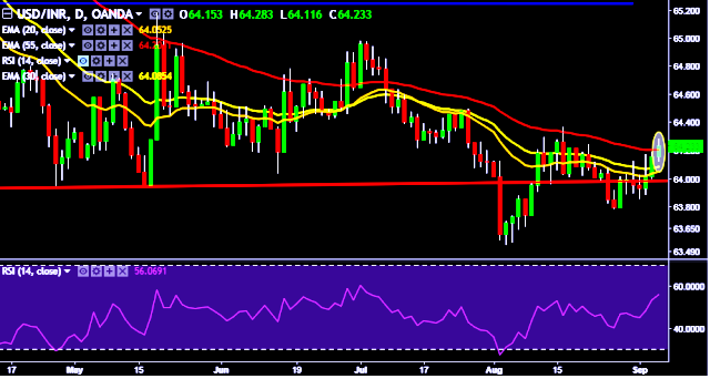 We prefer to take long position in USD/INR around 64.18, stop loss at 64.08 and target of 64.36/64.48.