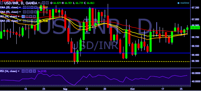 We prefer to take long position in USD/INR only above 66.96, stop loss at 66.78 and target of 67.28.