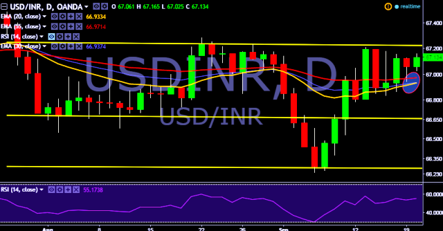 We prefer to take long position in USD/INR around 67.12, stop loss at 66.77 and target of 67.52/67.71.