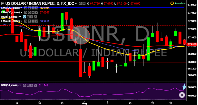 We prefer to take short position in USD/INR only below 67.05, stop loss at 67.28 and target of 66.82/66.62.
