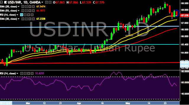 We prefer to take short position in USD/INR around 67.60, stop loss at 67.87 and target of 67.02.