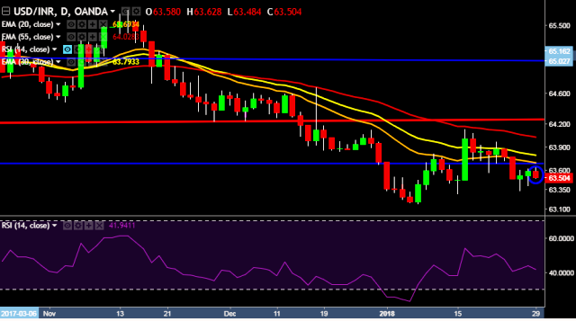 - Key resistances are seen at 63.62, 63.72, 63.87, 63.96, 64.05 and 64.12 marks respectively.