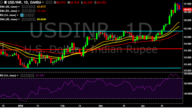 We prefer to take long position in USD/INR only above 66.92, stop loss at 66.50 and target of 67.20/67.48.