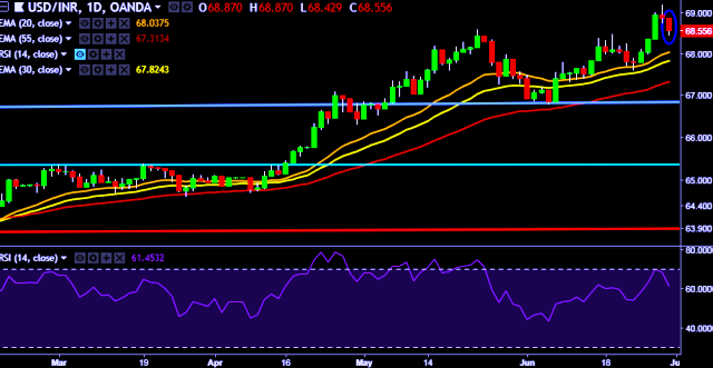 We prefer to take long position on USD/INR around 68.48, stop loss at 68.35 and target of 68.87/69.18.