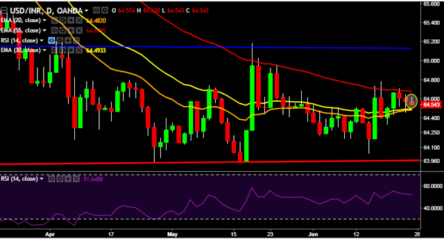 We prefer to take short position in USD/INR around 64.55, stop loss at 64.64 and target of 64.45/64.27/64.18.