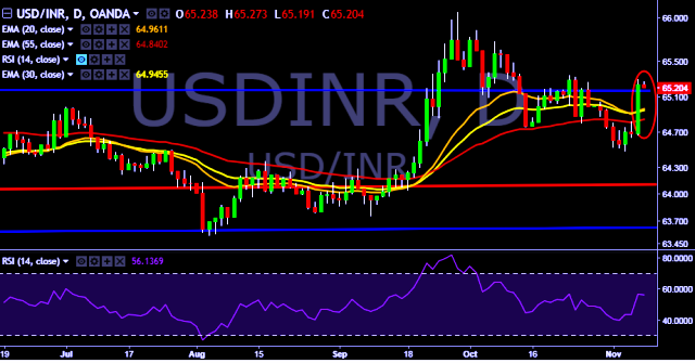 We prefer to take long position in USD/INR only above 65.30, stop loss at 65.07 and target of 65.48/65.72.
