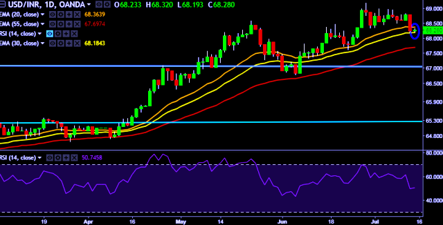 We prefer to take short position on USD/INR only below 68.15, stop loss at 68.47 and target of 67.79.