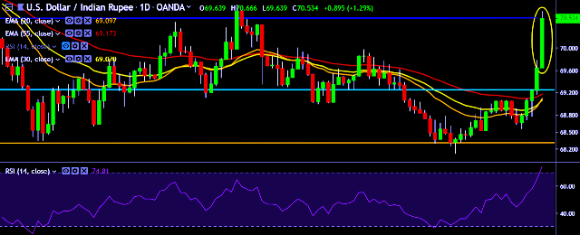 We prefer to take long position on USD/INR around 70.40, stop loss 69.60 and target of 71.26.