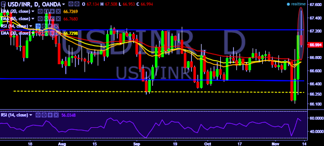 We prefer to take long position in USD/INR only above 67.18, stop loss 66.82 and target of 67.52/67.71.