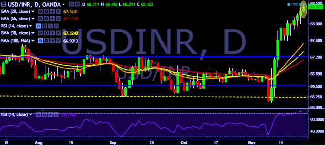 We prefer to take long position in USD/INR around 68.35, stop loss 67.96 and target of 68.90.
