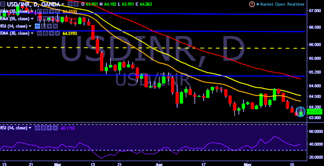We prefer to go long on USD/INR around 64.04, stop loss 63.94 and target of 64.15/64.22.