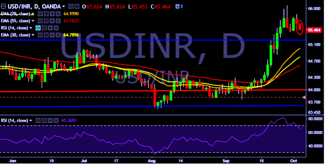 We prefer to take short position in USD/INR around 65.52, stop loss at 65.72 and target of 65.20.