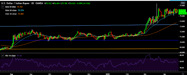 - USD/INR is currently trading around 76.02 marks.