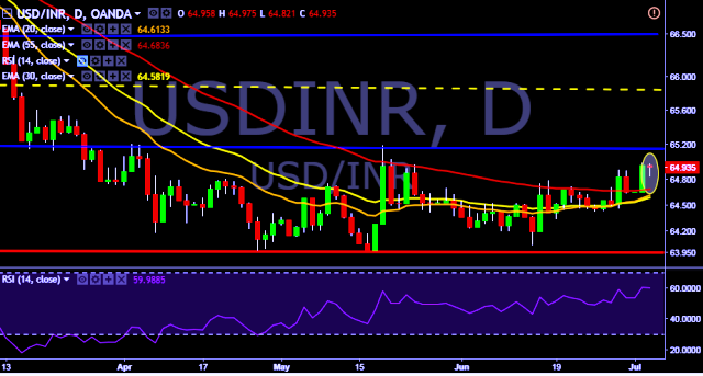 We prefer to take long position in USD/INR only above 64.99, stop loss at 64.82 and target of 65.18/65.25.