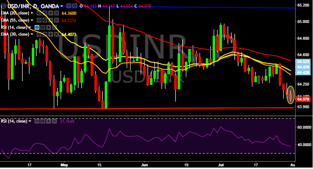 We prefer to take short position in USD/INR only below 64.03, stop loss at 64.25 and target of 63.65.