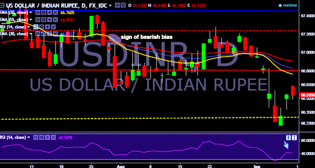 We prefer to take short position in USD/INR around 66.62, stop loss at 66.82 and target of 66.21/66.05.